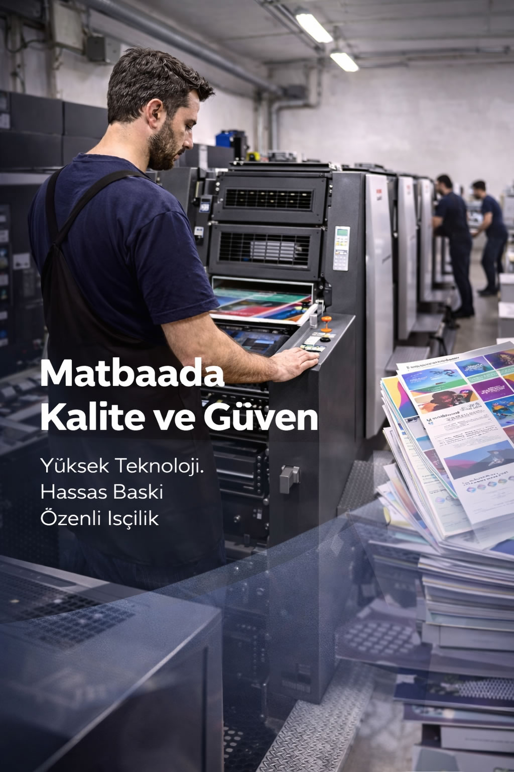 Üretim süreçlerimizin her aşamasında kalite kontrol ve zaman yönetimini ön planda tutarak, işletmelerin ihtiyaç duyduğu baskı çözümlerini güvenle sunuyoruz. Güçlü makine parkurumuz ve deneyimli ekibimiz sayesinde hem küçük ölçekli hem de yüksek adetli işlerde aynı titizlikle çalışıyoruz.