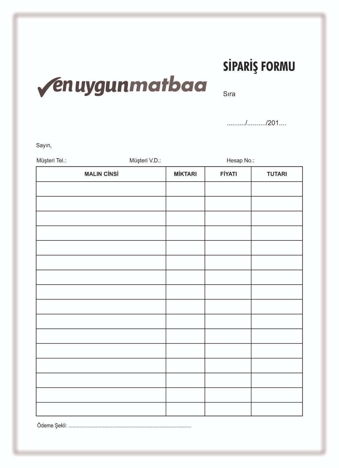 Eğer siz de A5 Sipariş Formu Tek Renk baskı, sipariş formu baskı, koçanlı sipariş formu, tek renk form baskı, kurumsal belge basımı ve uygun fiyatlı matbaa hizmeti arıyorsanız, En Uygun Matbaa doğru adrestir. Düzenli sipariş, sağlam kayıtla başlar. Sağlam kayıt ise işin hızını, kalitesini ve güvenini artırır.